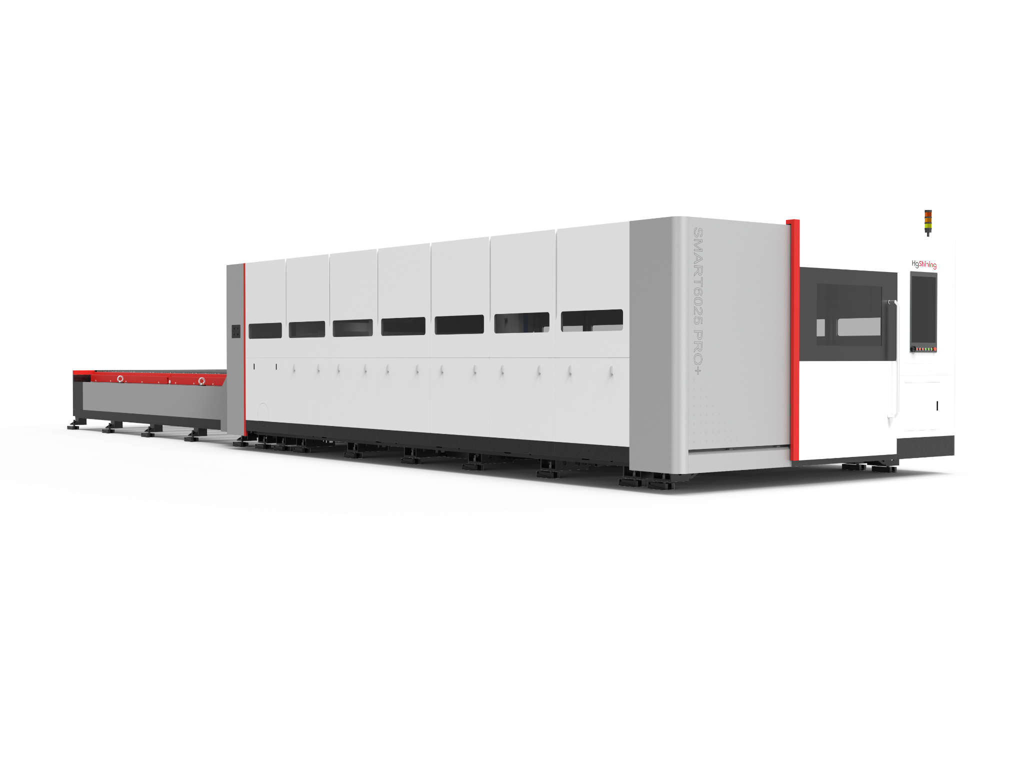 Máy cắt kim loại laser sợi quang công suất cao dòng SMART Pro có khay trao đổi, có tốc độ cắt nhanh hơn và có nguồn laser công suất cao hơn (1000W, 2000W, 3000W, 4000W, 6000W). Sản phẩm này sử dụng cấu trúc truyền động kép, có đặc điểm cấu trúc ổn định, độ cứng tốt và tốc độ định vị trục đơn X và Y có thể đạt tới hơn 80m/phút. gia tốc truyền động làm cho gia tốc cực đại của trục X và Y đạt 1,2 G.
